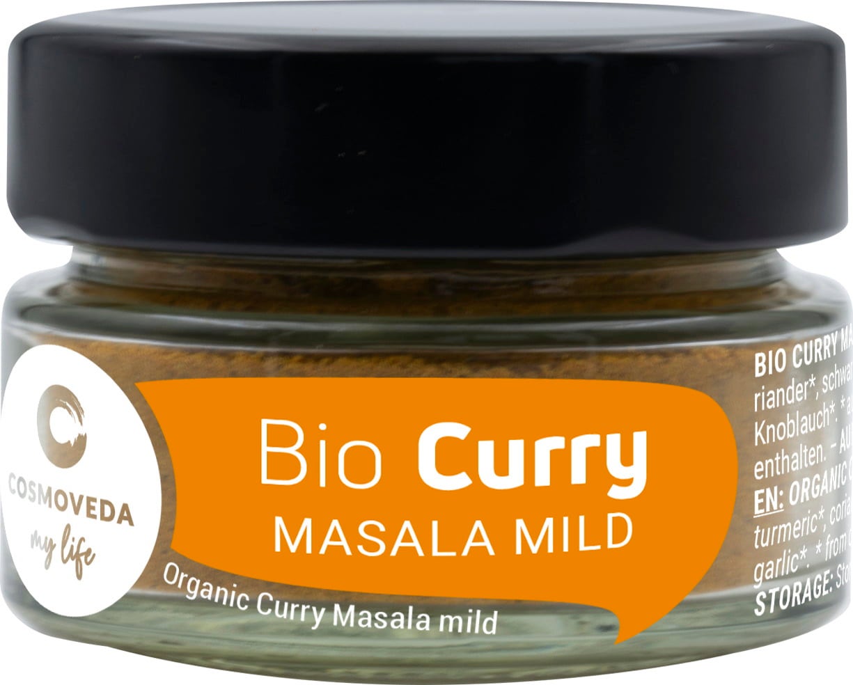 Das Cosmoveda Curry Masala mild ist eine Mischung aus 9 wertvollen Gewürzen und wird vielseitig in der Indischen und Ayurvedischen Küche verwendet.