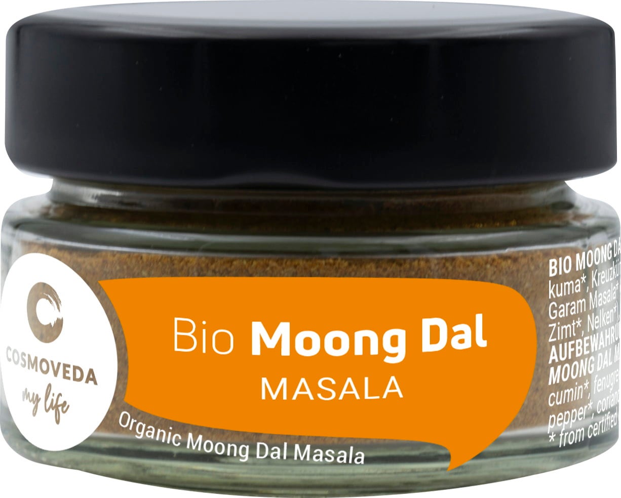 Bio Moong Dal Masala con Cosmoveda ist eine abgestimmte ayurvedische Mischung aus erlesenen Gewürzen für Moong Dal Gerichte.