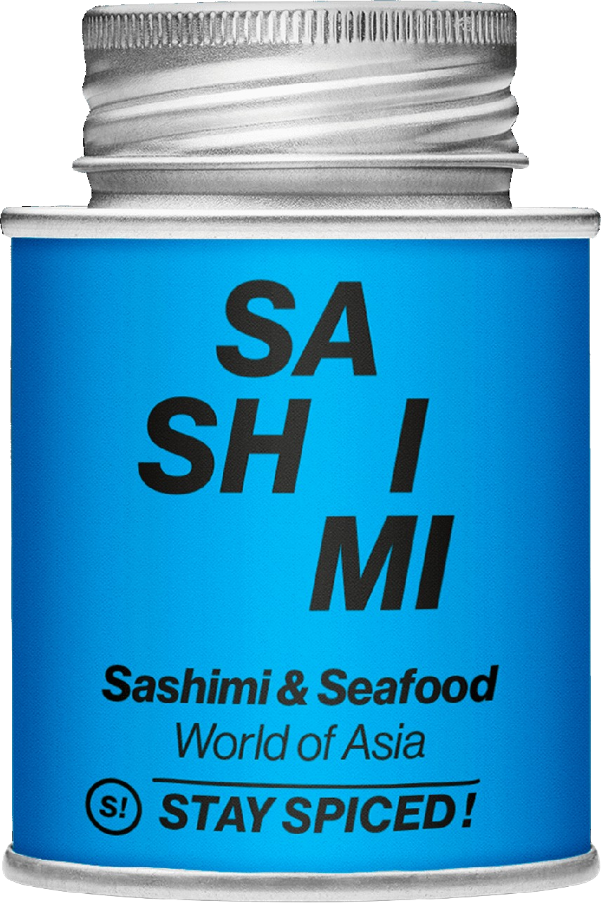Diese herausragende Kreation von Stay Spiced harmoniert hervorragend mit allen Fischen und Meeresfrüchten, die traditionell in Japan zur Zubereitung von Sashimi verwendet werden: Lachs, Thunfisch, Aal, Schwertfisch, Makrele und Riesenkrake sowie Eismeergarnelen, Jakobsmuscheln und Austern. Feinste Zutaten wie Sesam, Zitronenpfeffer, Koriander, Rosa Beeren und Fenchel geben Ihrem Fisch- oder Gemüsegericht eine ganz besondere asiatische Note.